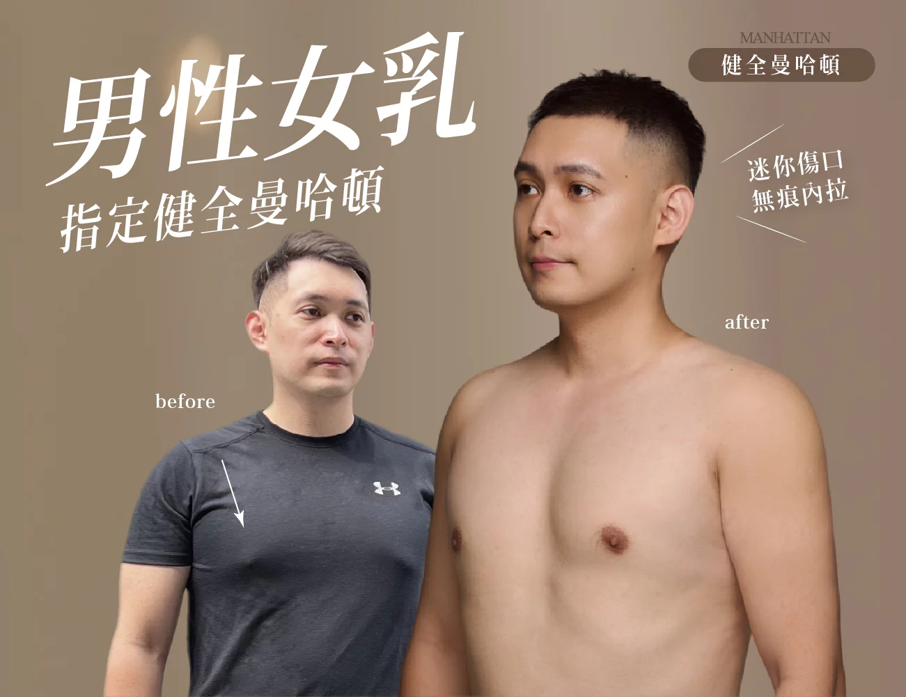 胸部大小、形狀的煩惱不只是女人的專利,許多男士也因為突顯的胸部而困擾不已。男性女乳顧名思義,就是男生的胸部有明顯的乳房組織存在。許多男士因男性女乳症因害羞不敢見人,或是極力避免游泳等運動,甚至於影響到走路姿勢,刻意彎腰駝背唯恐胸型引起他人注意,顯得缺乏自信心。